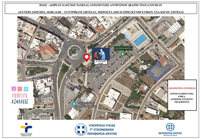 Επίσης, την ίδια ημέρα ελεγχοι ταχείας ανίχνευσης αντιγόνου Covid-19 (rapid test) σε πεζούς θα πραγματοποιηθούν και στη Σητεία.