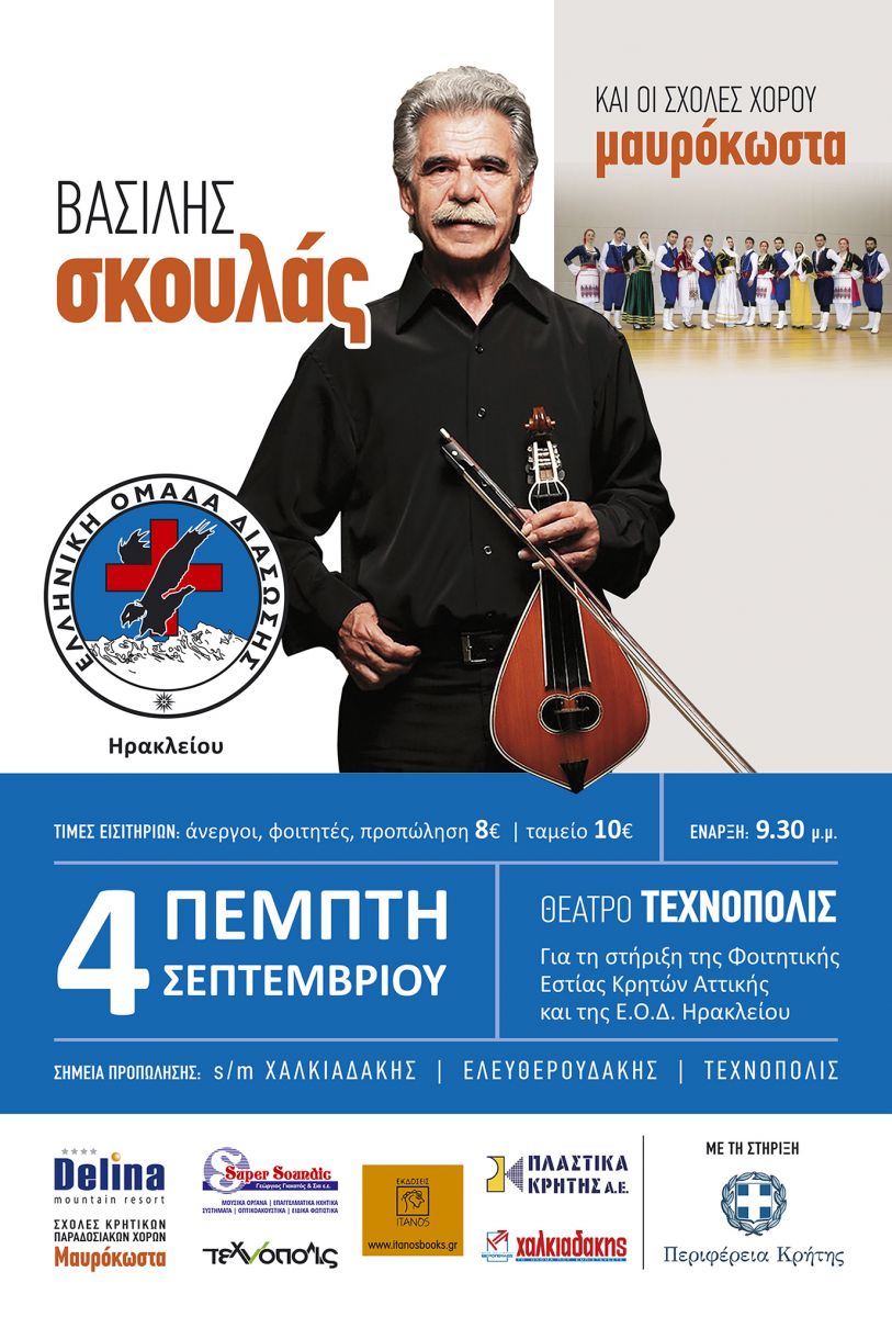 Η Ελληνική Ομάδα Διάσωσης Ηρακλείου διοργανώνει συναυλία με τον Βασίλη Σκουλά στην οποία θα συμμετέχουν και οι σχολές χορού Μαυρόκωστας. Η μουσική βραδιά θα πραγματοποιηθεί στον πολυχώρο Τεχνόπολις την Πέμπτη 4 Σεπτεμβρίου 2014, στις 21.30.