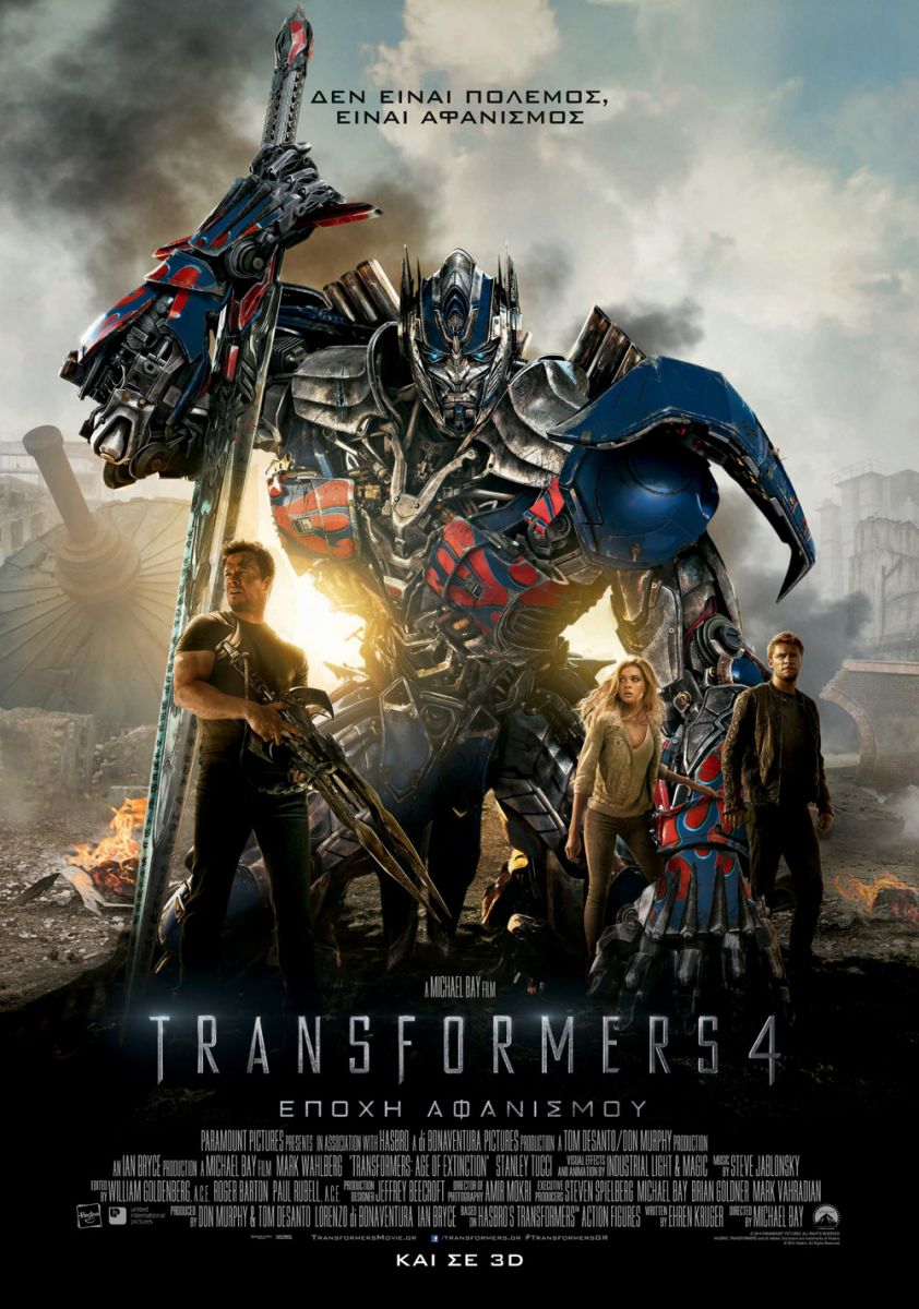 Υπόθεση: Ο μετρ των σπέσιαλ εφέ (που μας έχει δώσει από τα πιο εντυπωσιακά 3D), των τιτάνιων μαχών και των εγγυημένων μπλοκμπάστερ Μάικλ Μπέι υπογράφει σκηνοθετικά και το τέταρτο κεφάλαιο της μάχης των Autobots ενάντια στα Decepticons στην πλέον πολυαναμενόμενη περιπέτεια του καλοκαιριού κι η υπερπαραγωγή συνεχίζεται με την ταινία αυτή να αποτελεί τη συνέχεια της ιστορίας του προηγούμενου φιλμ. Transformers 4 Εποχή Αφανισμού (Transformers 4 Age of Extinction), λοιπόν, στο Σικάγο, τέσσερα χρόνια μετά την τελευταία μάχη που έλαβε χώρα στο Transformers: Dark of the Moon, με πρωταγωνιστή τον εξαιρετικό Μαρκ Γουόλμπεργκ, αλλά και με ανανεωμένο όλο το καστ (πάντα υπάρχει κι ένα σούπερ σέξι θηλυκό που αυτήν τη φορά ακούει στο όνομα Νίκολα Πελτς), ενώ τα Dinobots κάνουν την παρθενική τους εμφάνιση για να ανεβάσουν κι άλλο τον πήχη των συμπλοκών.