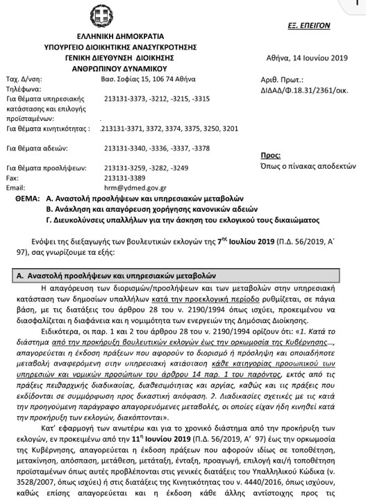 Σύμφωνα με την υπ’ αριθμόν ΔΙΔΑΔ/Φ.18.31/236/οικ. απόφαση που εκδόθηκε την Παρασκευή και με αφορμή το πάγωμα των προσλήψεων στους Δήμους έως πρώτη Σεπτεμβρίου, οι υφιστάμενοι συμβασιούχοι παίρνουν παράταση 6 μηνών.