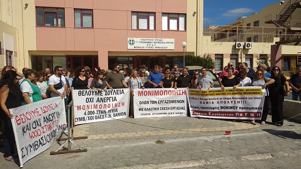Στη διαμαρτυρία συμμετείχαν μαζί μας εκπρόσωποι από τα σωματεία εργαζομένων των νοσοκομείων Χανίων, Αγίου Νικολάου, Ρεθύμνου, Βενιζελείου, Ιεράπετρας, τα σωματεία εργαζομένων ΘΨΠΧ, ΠΕΔΥ, 7ης ΥΠΕ, εκπρόσωποι των εργαζομένων από τα κέντρα υγείας και εργαζόμενοι με ελστικές σχέσεις εργασίας (ΟΑΕΔ, ΙΔΟΧ, επικουρικοί κλπ). Παραβρέθηκε και εξέφρασε την αλληλεγγύη του το σωματείο συνταξιούχων ΙΚΑ.