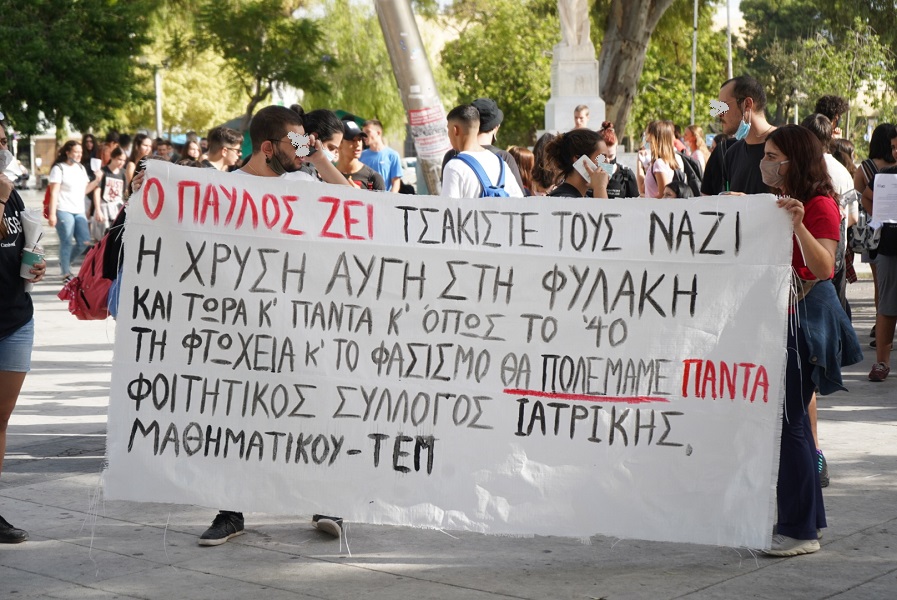 Με πανό και συνθήματα οι διαδηλωτές ζητούν την καταδίκη της Χρυσής Αυγής