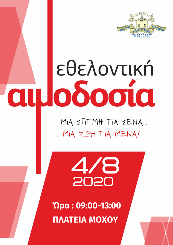 Ο Πολιτιστικός & Λαογραφικός Σύλλογος Μοχού "Η ΠΡΟΟΔΟΣ", καλεί σε δράση εθελοντικής αιμοδοσίας: