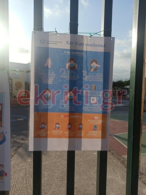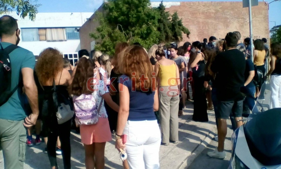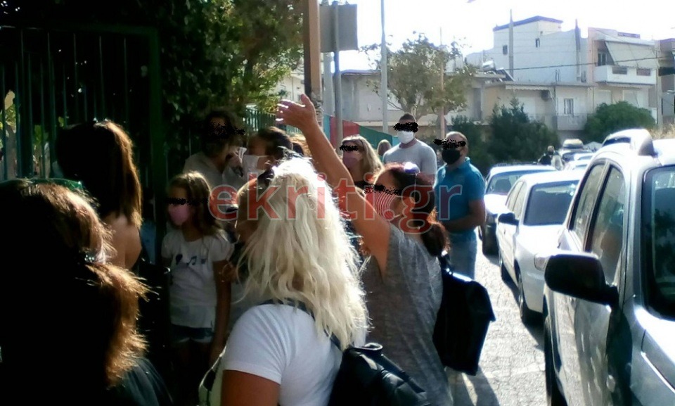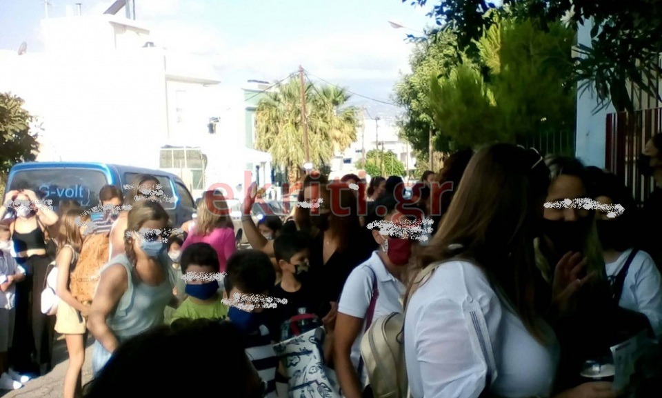 Οι εικόνες έξω από τα 28ο-57ο Δημοτικά Σχολεία του Ηρακλείου όπου οι πόρτες ήταν κλειστές, λίγο πριν τον αγιασμό, είναι αποκαρδιωτικές: συνωστισμός, με γονείς και μαθητές να μην κρατούν τις κρατούν αποστάσεις ασφαλείας.