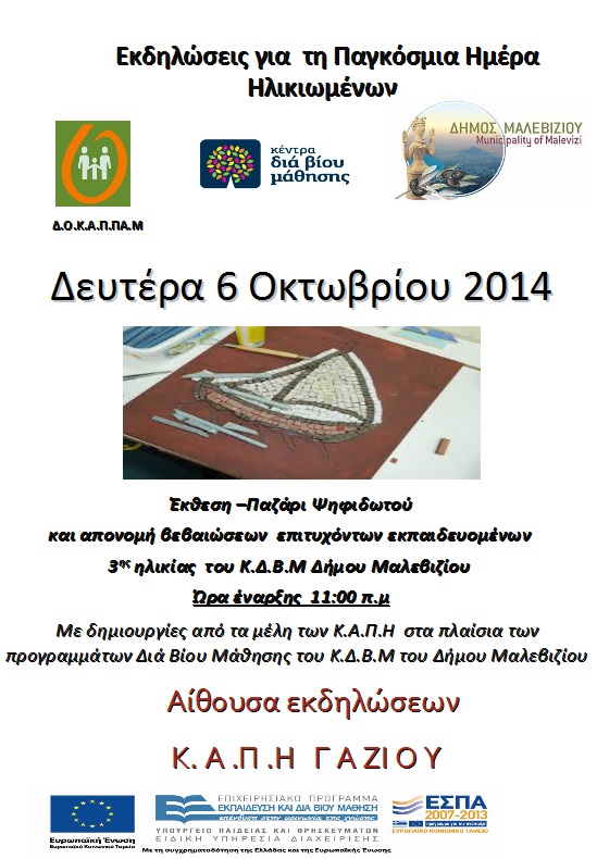 Στο πλαίσιο της παγκόσμιας ημέρας των Ηλικιωμένων, το Κ.Α.Π.Η. Γαζίου του Δ.Ο.Κ.Α.Π.ΠΑ.Μ. και το Κέντρο Δια Βίου Μάθησης του Δήμου Μαλεβιζίου, οργανώνουν εκδήλωση με έκθεση και παζάρι από τις δημιουργίες των μελών του Κ.Α.Π.Η., που κατασκευάστηκαν στα πλαίσια των προγραμμάτων που υλοποιούνται στη δομή.