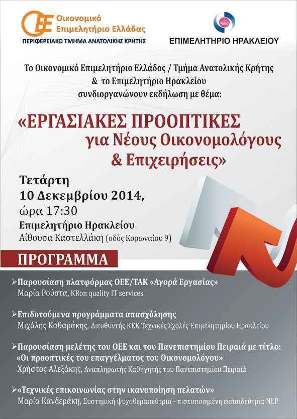 Πιο συγκεκριμένα, το Οικονομικό Επιμελητήριο και το Επιμελητήριο Ηρακλείου συνδιοργανώνουν την Τετάρτη 10 Δεκεμβρίου και ώρα 17:30 στην αίθουσα «Καστελλάκη» του Επιμελητηρίου Ηρακλείου (οδ. Κορωναίου 9), εκδήλωση με θέμα: «Εργασιακές Προοπτικές για Νέους Οικονομολόγους & Επιχειρήσεις».