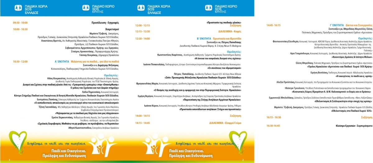 Τα ΠΑΙΔΙΚΑ ΧΩΡΙΑ SOS ΕΛΛΑΔΟΣ σας προσκαλούν στην έναρξη των εργασιών της Επιστημονικής Ημερίδας με τίτλο "Παιδί και Οικογένεια. Πρόληψη και Ενδυνάμωση", την Τετάρτη 4 Ιουνίου 2014 και ώρα 09:30, στην Αίθουσα Ανδρόγεω του Δήμου Ηρακλείου.
