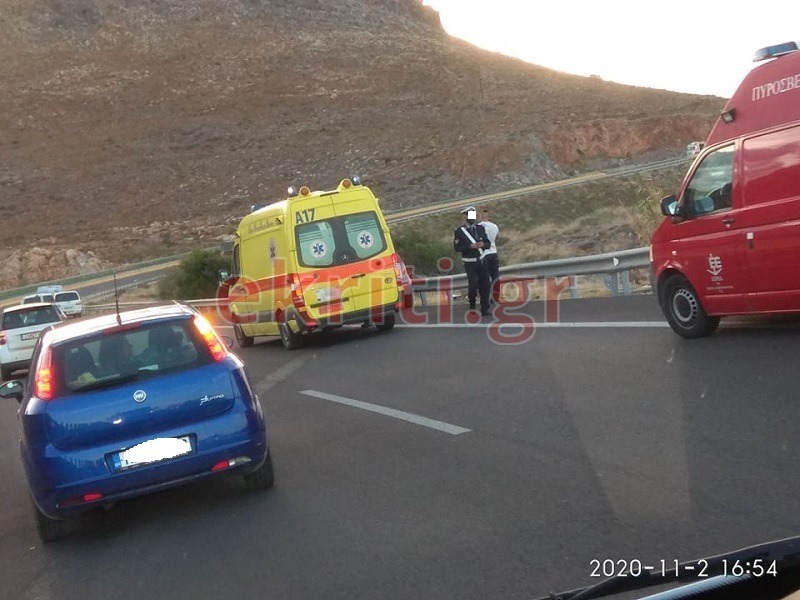 Ο οδηγός του δικύκλου έπεσε στο δρόμο και τραυματίστηκε - ευτυχώς - ελαφρά και μεταφέρθηκε με ασθενοφόρο του ΕΚΑΒ στο Πανεπιστημιακό Νοσοκομείο του Ηρακλείου.