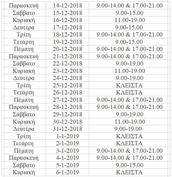 Το εορταστικό ωράριο των καταστημάτων στην πόλη του Ηρακλείου ανακοίνωσε ο Εμπορικός Σύλλογος. Σύμφωνα με αυτό, τα καταστήματα θα λειτουργήσουν για την εορτή των Χριστουγέννων ως εξής: