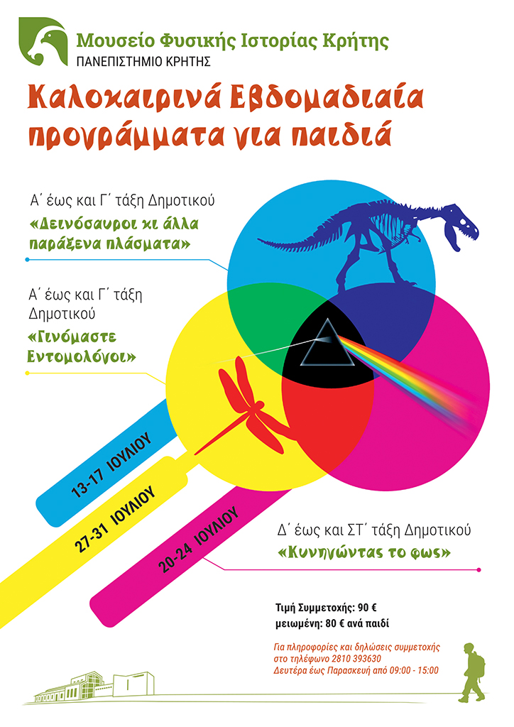 "Το Μουσείο Φυσικής Ιστορίας Κρήτης-Πανεπιστήμιο Κρήτης για τον μήνα Ιούλιο επιστρέφει και για τους μικρούς του φίλους! Τα εβδομαδιαία καλοκαιρινά προγράμματα του Μουσείου υλοποιούνται από Δευτέρα έως και Παρασκευή από τις 09:00 έως τις 15:00 πάντα υπό το βλέμμα των επιστημόνων και των μουσειοπαιδαγωγών του Μουσείου! Τα προγράμματα του Μουσείου προωθούν την επιστημονική γνώση μέσα από τη βιωματική –ανακαλυπτική- μάθηση και τα τελευταία χρόνια αποτελούν μία από τις πρώτες επιλογές απασχόλησης των παιδιών!