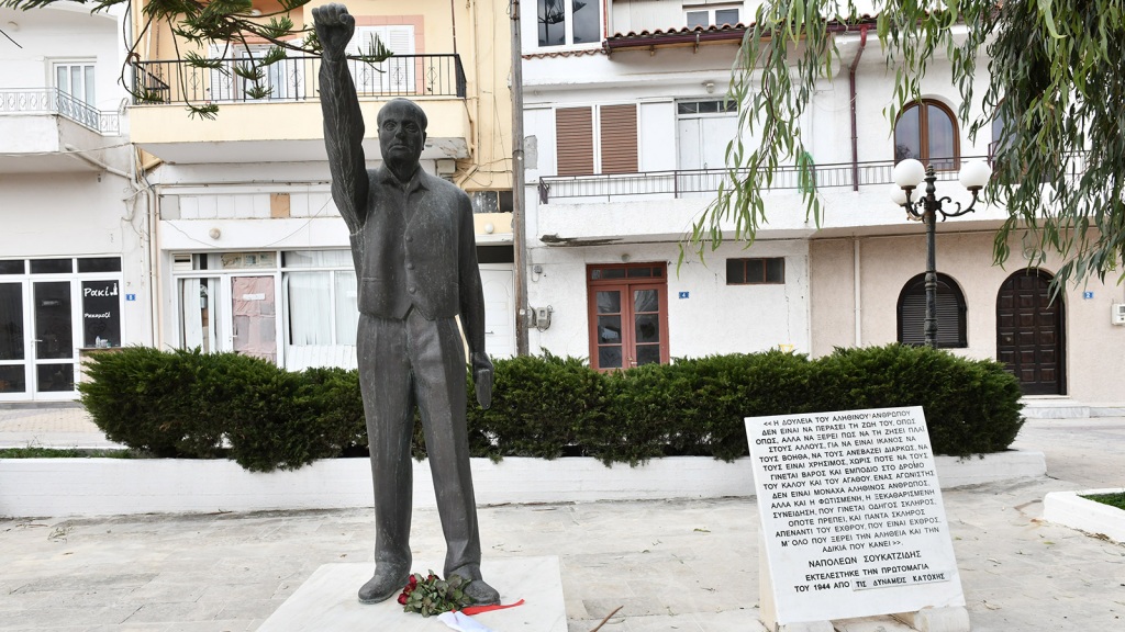 Στην συνέχεια της περιοδείας του ο κος Κουτσούμπας έκανε μια στάση προκειμένου να εναποθέσει λίγα λουλούδια στο άγαλμα του Ναπολέοντα Σουκατζίδη το οποίο βρίσκεται στο κέντρο του Αρκαλοχωρίου.