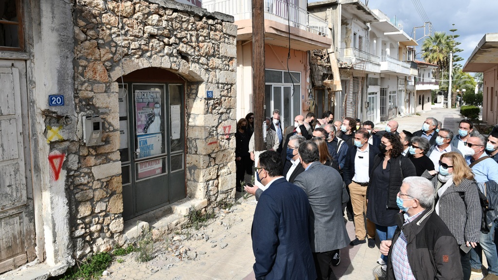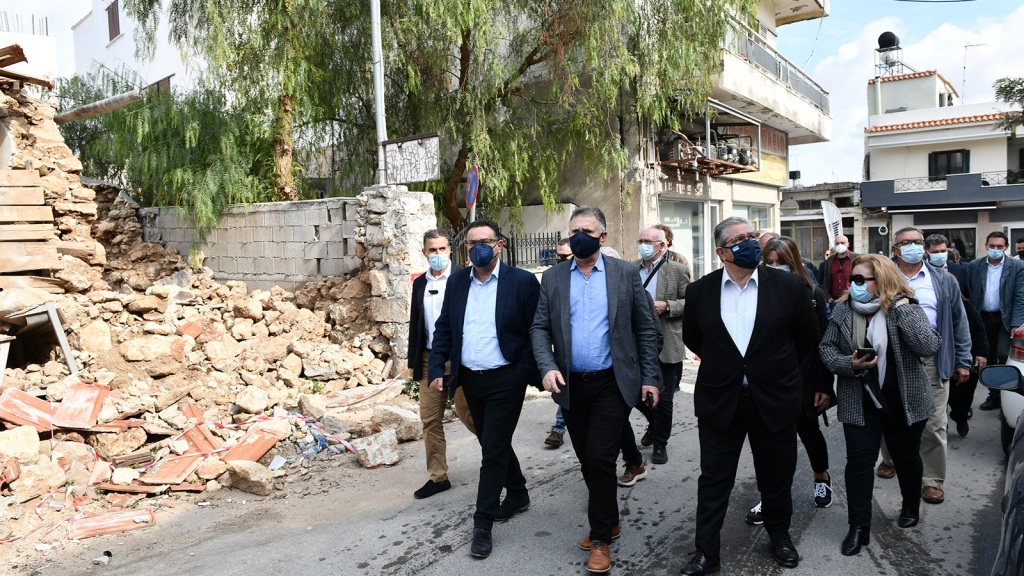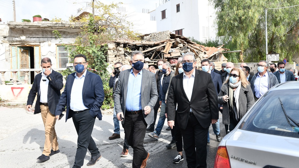 Αμέσως μετά ο ΓΓ της ΚΕ του ΚΚΕ συναντήθηκε με τον Δήμαρχο Μινώα Πεδιάδος Μανώλη Φραγάκη, ο οποίος τον συνόδευσε σε μια βόλτα στο κέντρο του χωριού το οποίο έχει πληγεί ιδιαίτερα από το σεισμό. Η εικόνα που αντικρίζει κανείς είναι αυτή μιας έρημης πόλης, καθώς υπάρχουν πολλές και σοβαρές καταστροφές στα κτίρια.