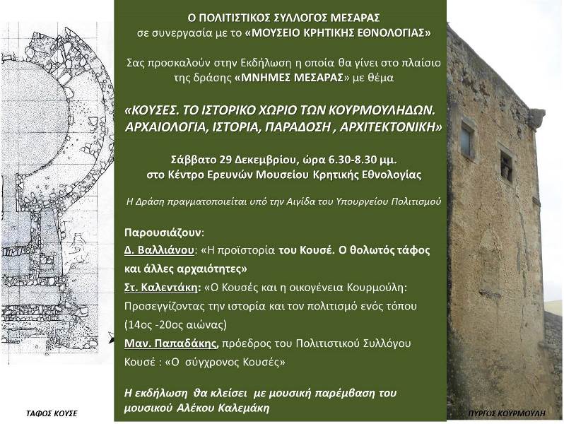 Μια πολύ ωραία εκδήλωση θα πραγματοποιηθεί στις 29 Δεκεμβρίου, 6,30-8,30 μμ, στο Κέντρο Ερευνών του Μουσείου Κρητικής Εθνολογίας με θέμα: "Κουσές, Το ιστορικό χωριό των Κουρμούληδων".