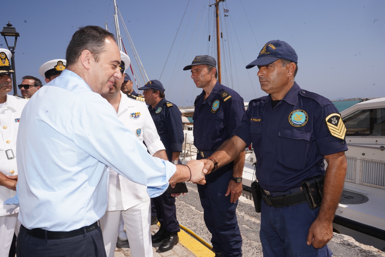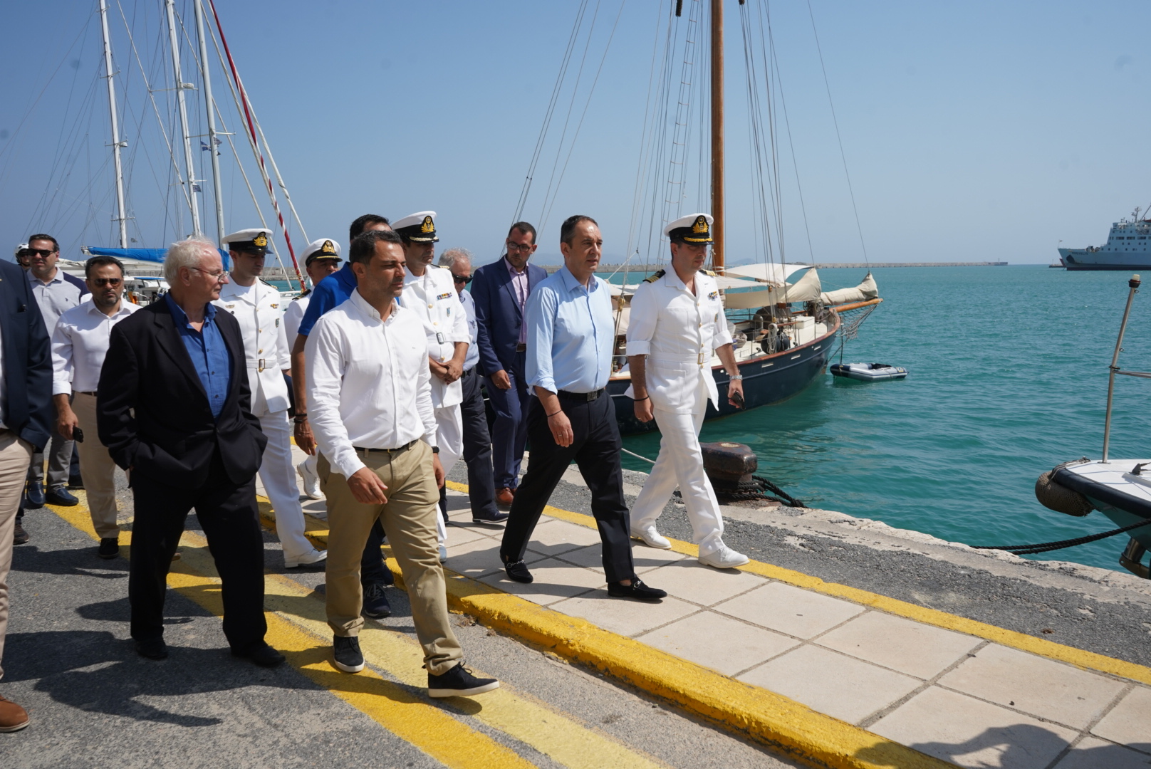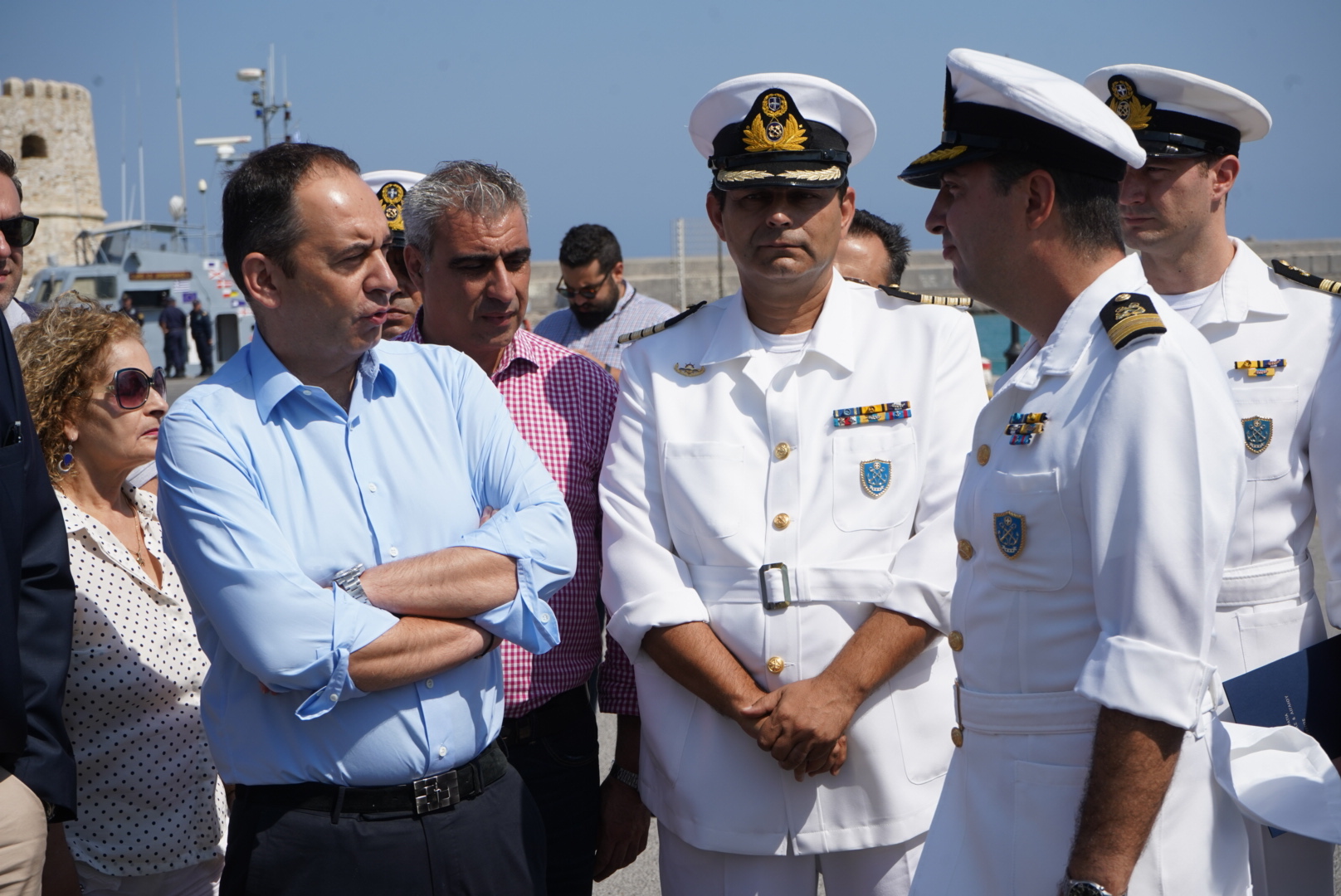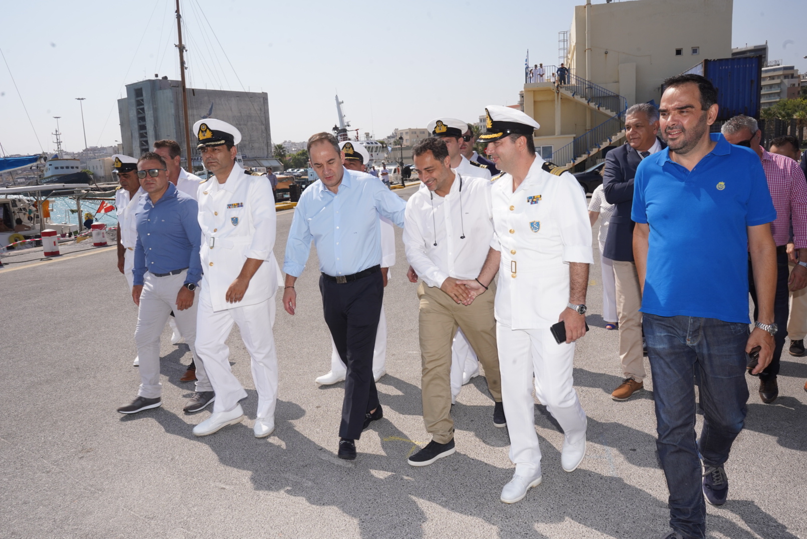 (O Υπουργός Ναυτιλίας με τον Κεντρικό Λιμενάρχη Ηρακλείου Αντιπλοίαρχο ΛΣ Ευθύμθιο Δουβή (δεξιά) και τον Γενικό περιφερειακό Διοικητή του ΛΣ στην Κρήτη, Πλοίαρχο Σπύρο Πασσάκο αριστερά).