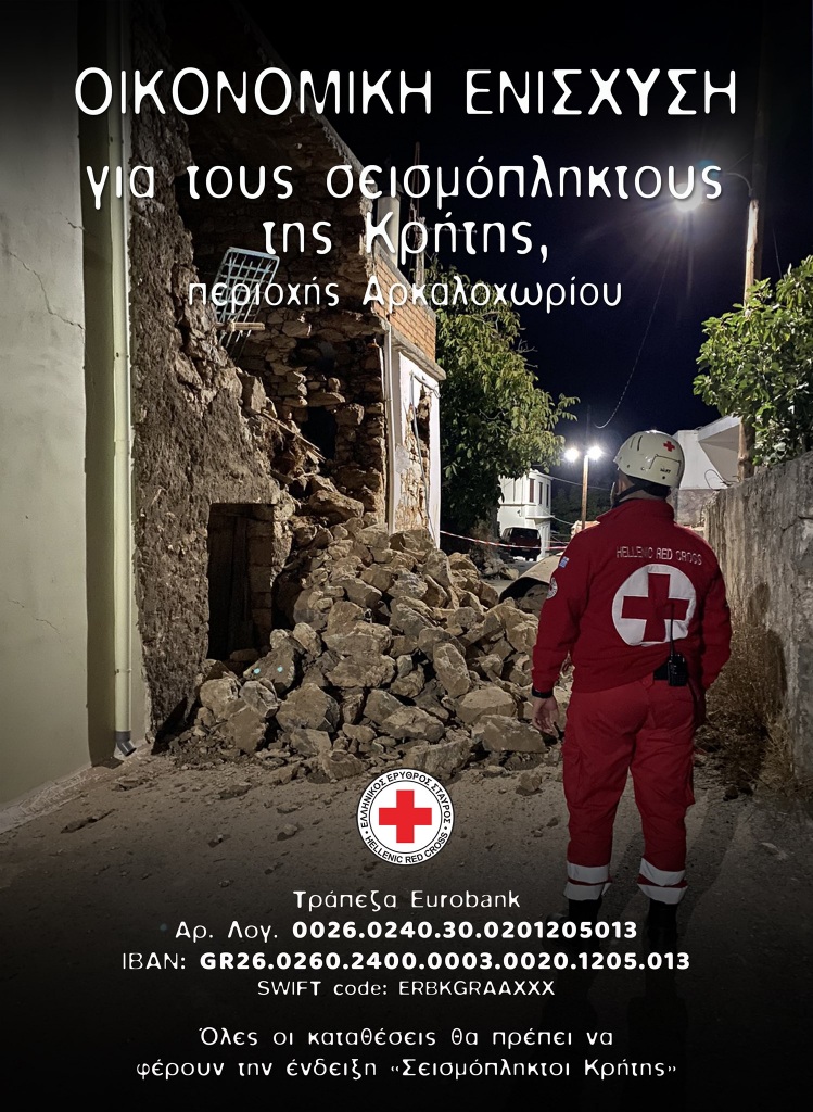 Ο Ελληνικός Ερυθρός Σταυρός - μέλη του οποίου βρίσκονται από την πρώτη στιγμή στις πληγείσες περιοχές - απευθύνει έκκληση στους συμπολίτες μας που μπορούν να συνδράμουν οικονομικά στην στήριξη των σεισμόπληκτων που είδαν τις περιουσίες τους να χάνονται.