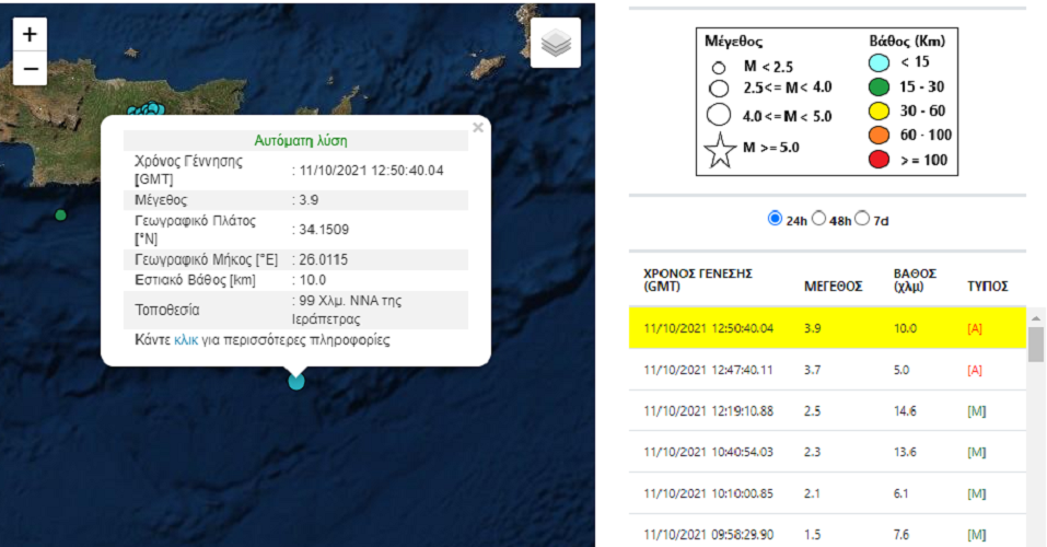 Λίγο αργότερα στις 15:50:44 σημειώθηκε ένας ακόμα σεισμός 99 Χλμ. ΝΝΑ της Ιεράπετρας και είχε μέγεθος 3,9 Ρίχτερ και εστιακό βάθος 10 χλμ.