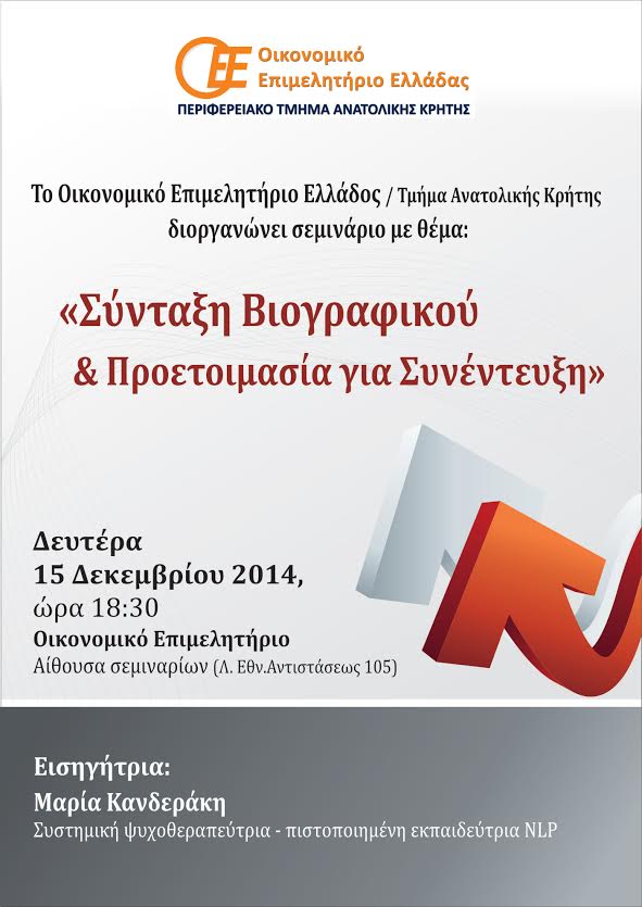 Την Δευτέρα 15 Δεκεμβρίου και ώρα 18:30 στην αίθουσα σεμιναρίων του Περιφερειακού Τμήματος (Λ. Εθνικής Αντιστάσεως 105) θα πραγματοποιηθεί σεμινάριο με θέμα «Σύνταξη βιογραφικού και Προετοιμασία για Συνέντευξη» με εισηγήτρια την κ. Μαρία Κανδεράκη, Οικονομολόγο - Συστημική Ψυχοθεραπεύτρια & Πιστοποιημένη Εκπαιδεύτρια NLP.