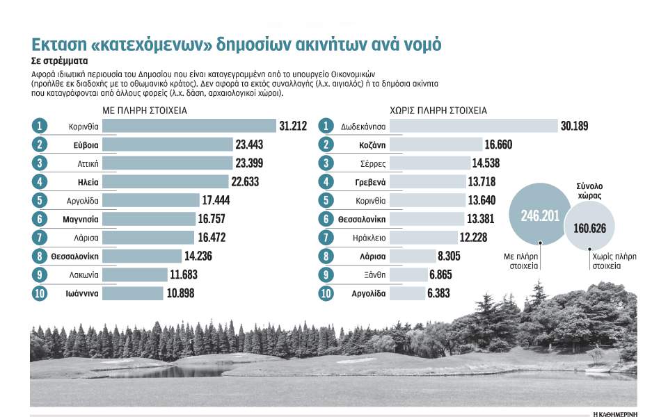 Τα περισσότερα καταπατημένα δημόσια ακίνητα με πλήρη στοιχεία βρίσκονται στην Κορινθία (31.212 στρέμματα) και ακολουθούν η Εύβοια (23.443 στρέμματα), η Αττική (23.399 στρέμματα) και η Ηλεία (22.633 στρέμματα). Σημαντικός είναι και ο αριθμός των κατεχόμενων δημοσίων ακινήτων στην Αργολίδα, στη Μαγνησία, στη Λάρισα και στη Θεσσαλονίκη.