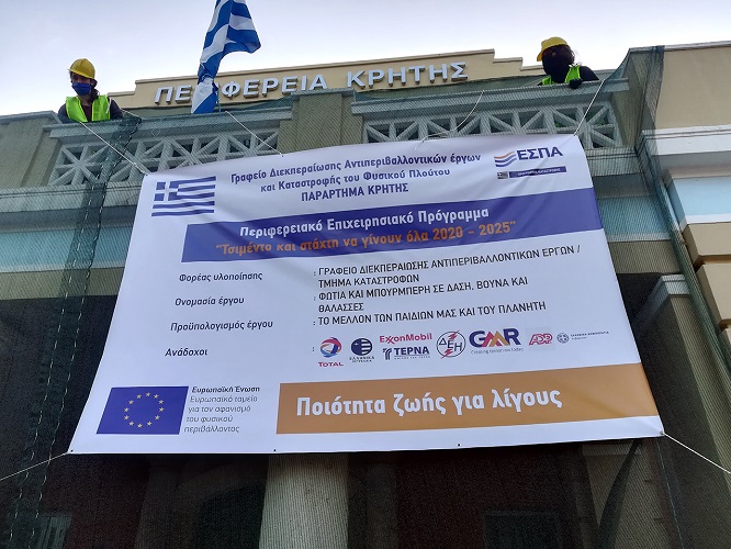 Στο Ηράκλειο, με τρόπο διαφορετικό, βάλαμε κι εμείς το λιθαράκι μας σ’ αυτό τον αγώνα. Καλύψαμε συμβολικά την πρόσοψη του κτιρίου της Περιφέρειας με οικοδομικό δίχτυ, αναρτήσαμε προσωρινή πινακίδα έργου, και μετατρέψαμε έτσι το φορέα σε υποκατάστημα εταιρειών εκμετάλλευσης του φυσικού μας πλούτου!