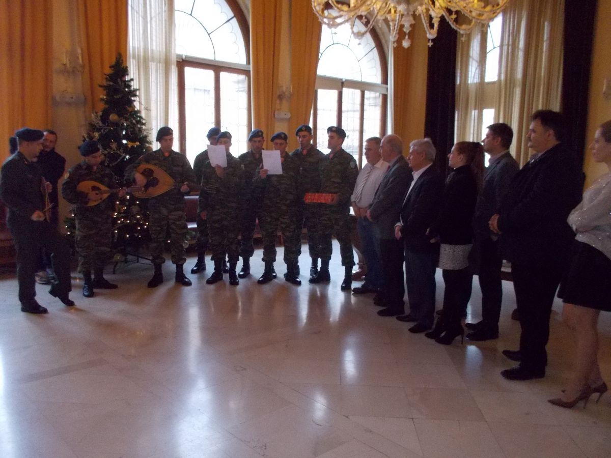 Παραδοσιακά Κρητικά κάλαντα της Πρωτοχρονιάς έψαλλαν οι στρατευμένοι της ΣΕΑΠ και της 126 Σμηναρχίας Μάχης, στο Δήμαρχο Ηρακλείου κ. Βασίλη Λαμπρινό στο Δήμαρχο Μαλεβιζίου κ. στο ΔΚώστα Μαμουλάκη που βρέθηκε στη Λότζια μαζί με τον πρόεδρο της ΔΕΥΑΒ κ.Φίλλιπο Σαββάκη και στους Αντιδημάρχους Γιώργο Καραντινό, Μαρία Καναβάκη, Κώστα Βαρδαβά, Αριστέα Πλεύρη και Γιάννη Ρασούλη.