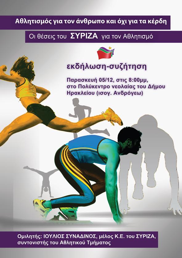 Το Τμήμα Αθλητισμού της Ν.Ε. Ηρακλείου, στα πλαίσια της διαβούλευσης του κυβερνητικού προγράμματος του ΣΥΡΙΖΑ, οργανώνει εκδήλωση παρουσίασης του Προγράμματος για τον Αθλητισμό και τη Φυσική αγωγή, την Παρασκευή 5 Δεκεμβρίου 2014 και ώρα 8:00μ.μ., στο Πολύκεντρο Νεολαίας του Δήμου Ηρακλείου (ισογ. Ανδρόγεω), με ομιλητή τον Ιούλιο Συναδινό, μέλος Κ.Ε. του ΣΥΡΙΖΑ και συντονιστή του Αθλητικού Τμήματος.