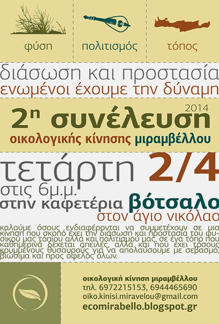 Την Τετάρτη 2 Απριλίου , στις 6:οο μ.μ. πραγματοποιείται η 2η συνέλευση Οικολογικής Κίνησης Μιραμβέλου στην καφετέρια βότσαλο στον Άγιο Νικόλαο.