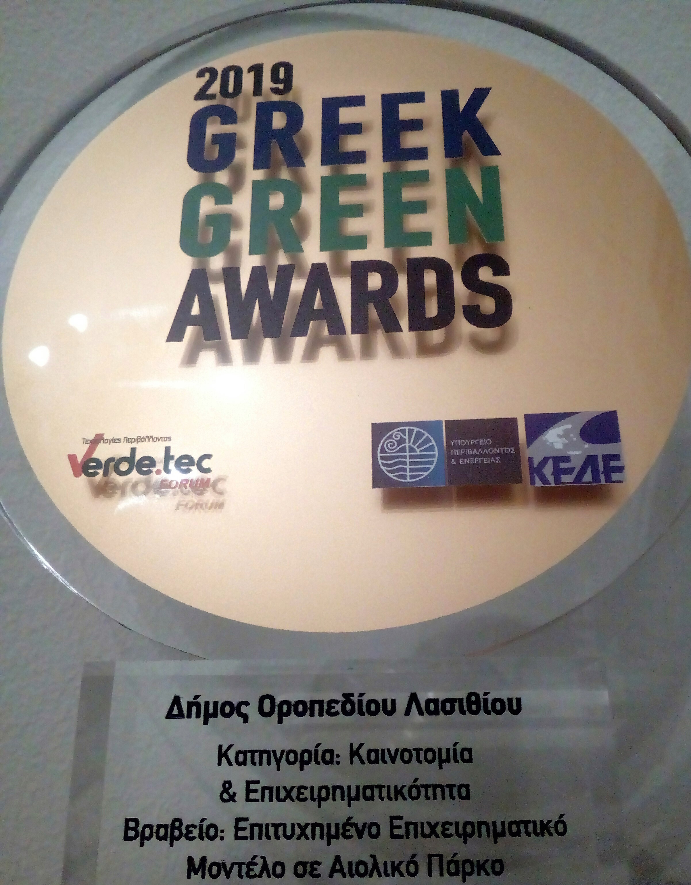 Το πρώτο βραβείο «Greek Green Awards 2019» στην κατηγορία: Καινοτομία και επιχειρηματικότητα απέσπασε ο Δήμος Οροπεδίου Λασιθίου. Ειδικότερα ο Δήμος Οροπεδίου συμμετείχε στην έκθεση Verde Tec στο MEC Παιανίας στον κορυφαίο θεσμό για την Κυκλική Οικονομία και το περιβάλλον με την στήριξη του Υπουργείου Περιβάλλοντος και Ενέργειας και της Κεντρικής Ένωσης Δήμων Ελλάδας.