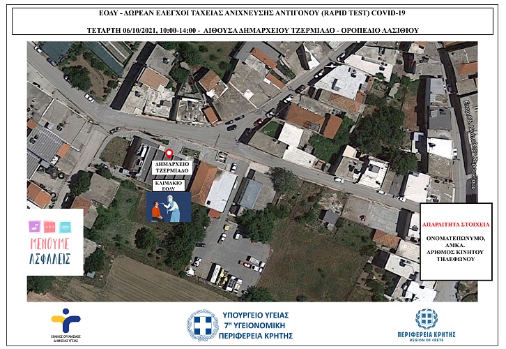 Έλεγχοι ταχείας ανίχνευσης αντιγόνου Covid-19 (rapid test) σε πεζούς θα πραγματοποιηθούν την Τετάρτη 06/10/2021 από κλιμάκια του ΕΟΔΥ στο Τζερμιάδο.