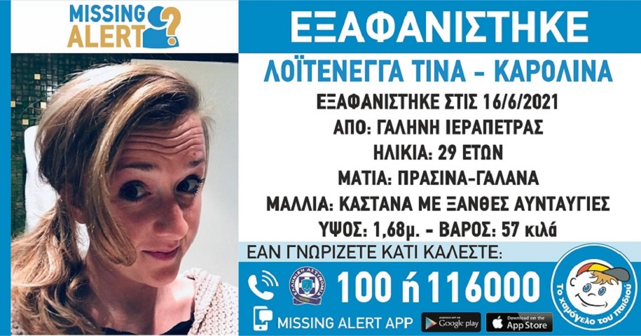 Στις 16/06/21 και ώρα 15:15, εξαφανίστηκε από την περιοχή του οικισμού Γαλήνη Ιεράπετρας Κρήτης, η Τίνα - Καρολίνα Λοϊτενέγγα, 29 ετών. Το «Χαμόγελο του Παιδιού» ενημερώθηκε για την εξαφάνισή της σήμερα στις 17/6/2021 και προχώρησε στη δημοσιοποίηση των στοιχείων της ενήλικης κατόπιν αιτήματος του οικείου περιβάλλοντος της καθώς ενδέχεται να συντρέχουν λόγοι οι οποίοι θέτουν τη ζωή της σε κίνδυνο. Επιπλέον, ο Οργανισμός μας έχει κινητοποιήσει την ειδική εθελοντική Ομάδα Έρευνας και Διάσωσης «Θανάσης Μακρής» την οποία διαθέτει και η οποία συμμετέχει στην έρευνες αναζήτησης με 6 μέλη, 2 οχήματα και έναν εκπαιδευμένο σκύλο, σε συνεργασία με τις αρμόδιες αρχές. Η Τίνα - Καρολίνα έχει ύψος 1,68 μ., έχει 57 κιλά βάρος, έχει καστανά μαλλιά με ξανθές ανταύγειες και πράσινα-γαλανά μάτια.