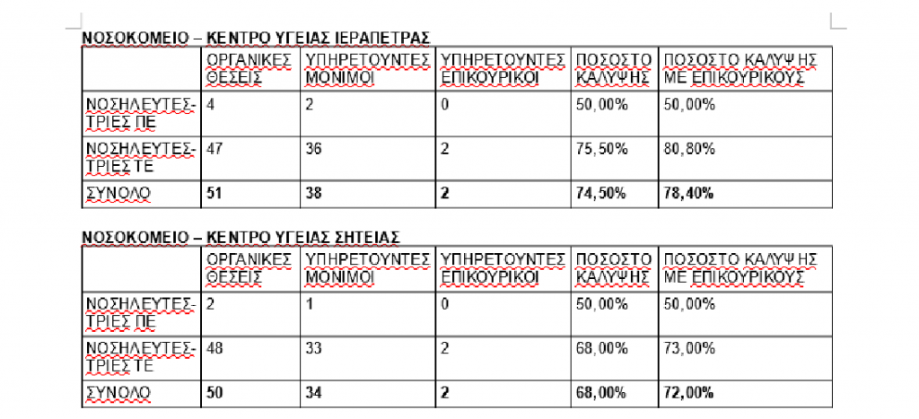 Με την παρούσα επιστολή θα θέλαμε να σας επισημάνουμε το οξύ πρόβλημα έλλειψης προσωπικού νοσηλευτών – νοσηλευτριών που υφίσταται στα Νοσοκομεία του ν. Λασιθίου και να ζητήσουμε τις παρεμβάσεις σας για την επίλυση ή άμβλυνση του συγκεκριμένου προβλήματος.