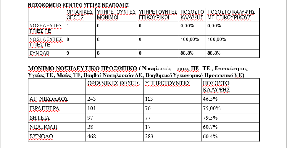 Όπως προκύπτει από τα στοιχεία το ποσοστό κάλυψης των οργανικών θέσεων νοσηλευτών – τριών στα Νοσοκομεία του νομού Λασιθίου είναι 55,2%, ενώ ακόμα και αν προσθέσουμε το επικουρικό προσωπικό το ποσοστό κάλυψης είναι 59%, δηλαδή οι 4 στις 10 οργανικές θέσεις νοσηλευτών -τριων στο νομό Λασιθίου είναι κενές.