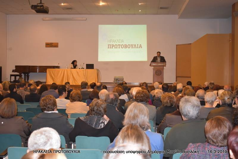 Η παρουσίαση της υποψηφιότητας του υποψήφιου Δημάρχου της Ηράκλειας Πρωτοβουλίας κ. Μανόλη Βασιλάκη έγινε το Σάββατο 16 Μαρτίου σύμφωνα με δελτίο τύπου που εξέδωσε την Κυριακή το βράδυ η δημοτική παράταξη στην αίθουσα «Μανόλης Καρέλλης» του δημοτικού κτηρίου της οδού Ανδρόγεω
