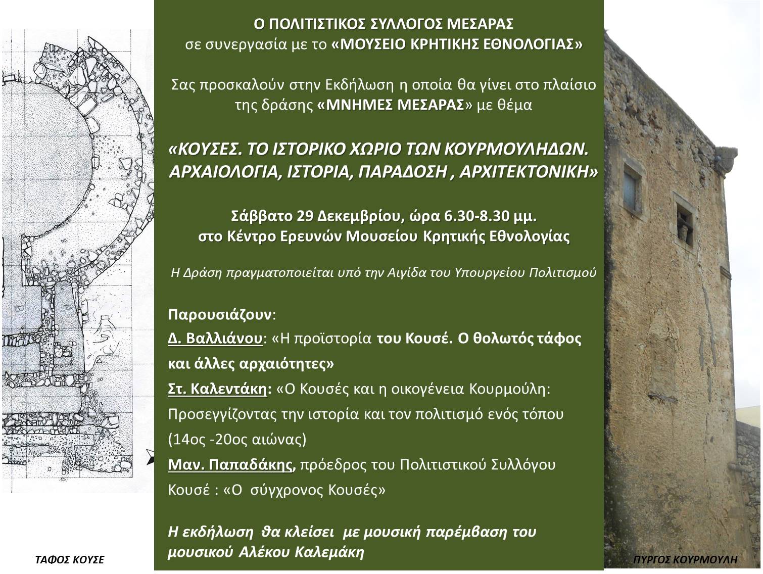 Τώρα προσκαλούμε τους Μεσαρίτες και όχι μόνον να παρευρεθούν στην εκδήλωση: «ΚΟΥΣΕΣ. ΤΟ ΙΣΤΟΡΙΚΟ ΧΩΡΙΟ ΤΩΝ ΚΟΥΡΜΟΥΛΗΔΩΝ. ΑΡΧΑΙΟΛΟΓΙΑ, ΙΣΤΟΡΙΑ, ΠΑΡΑΔΟΣΗ, ΑΡΧΙΤΕΚΤΟΝΙΚΗ» το Σάββατο 29 Δεκεμβρίου, ώρα 6,30-8,30 μμ. στο Κέντρο Ερευνών Μουσείου Κρητικής Εθνολογίας , στους Βώρους.