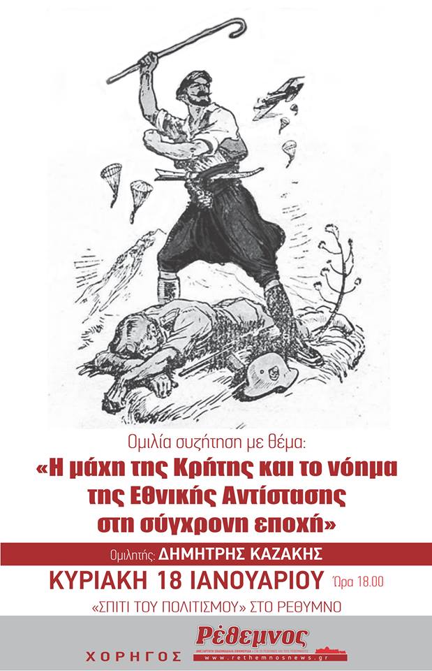 Ο Τομέας ΕΠΑΜ Κρήτης, διοργανώνει ανοιχτή παγκρήτια εκδήλωση την Κυριακή 18 Ιανουαρίου 2015 και ώρα 6:00μ.μ., στο Σπίτι του Πολιτισμού στο Ρέθυμνο, με ομιλητή τον οικονομολόγο - αναλυτή κ. Δημήτρη Καζάκη. Η εκδήλωση ονομάζεται: "Η μάχη της Κρήτης και το νόημα της εθνικής αντίστασης στην σύγχρονη εποχή".