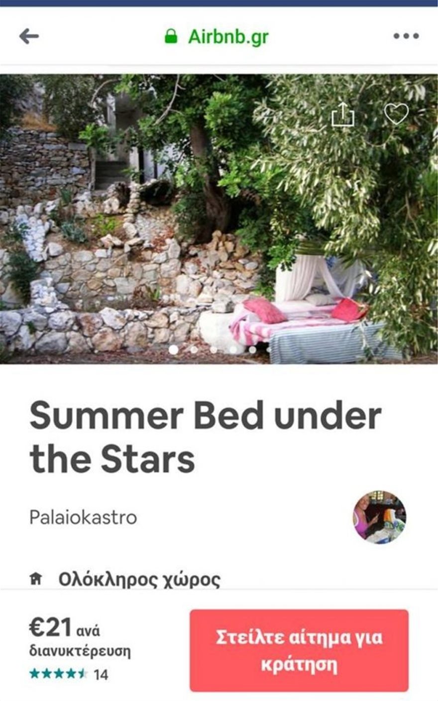 Το μήνυμα της ιδιοκτήτριας στο Airbnb αναφέρει το εξής: «Να ονειρεύεσαι κάτω από 1.000 αστέρια στο καλοκαιρινό κρεβάτι. Να κοιμάσαι σε ανοιχτό χώρο, αλλά σε ένα όμορφο και “ζεστό” κρεβάτι! Μόλις 100 μέτρα από τη θάλασσα και 13 χιλιόμετρα από τη βασική πόλη της Κρήτης, το Ηράκλειο».