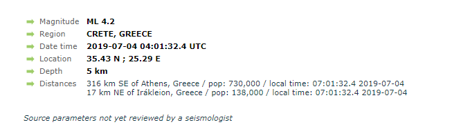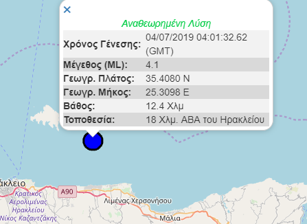 Ο σεισμός, σύμφωνα με την αυτόματη λήψη του του Γεωδυναμικού Ινστιτούτου του Εθνικού Αστεροσκοπείου Αθηνών είχε ένταση 4,1 Ρίχτερ και επίκεντρο τα 17 χιλιόμετρα Ανατολικά του Ηρακλείου, κοντά στη Νήσο Ντία. Το εστιακό βάθος εντοπίζεται στα 12 χλμ.