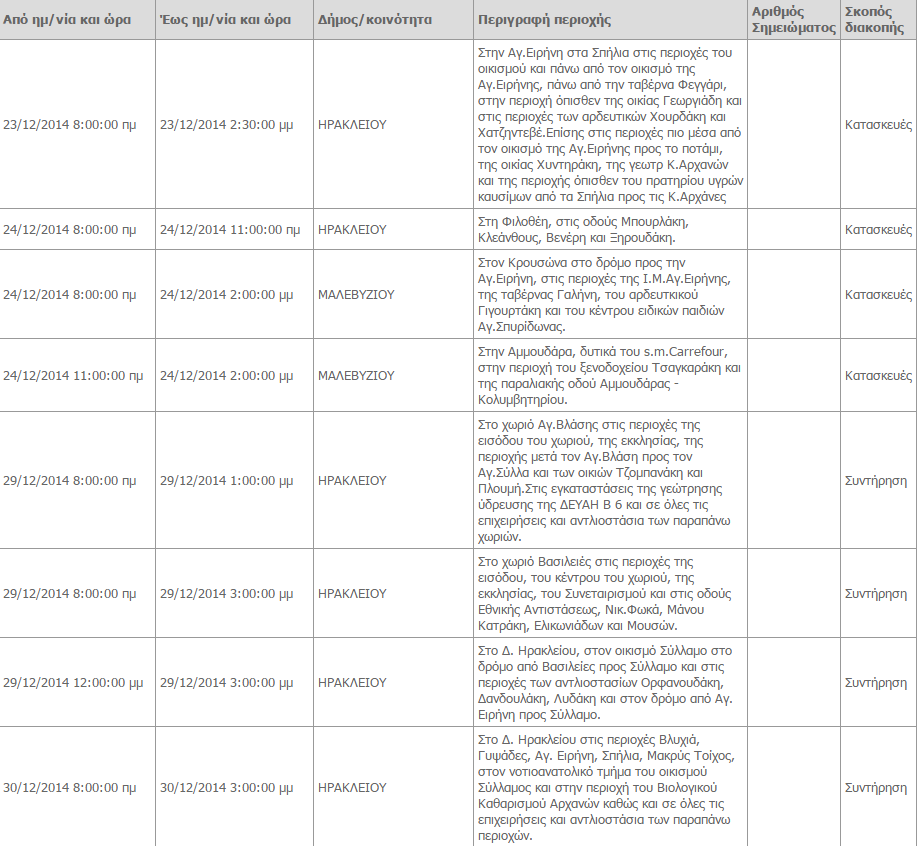 Διακοπές ρεύματος θα σημειωθούν στην πόλη του Ηρακλείου από την τετάρτη 24 Δεκεμβρίου μέχρι και τις 30 του μήνα, σύμφωνα με το πρόγραμμα διακοπών ρεύματος που έχει αναρτήσει στην σελίδα του ο ΔΕΔΗΕ.