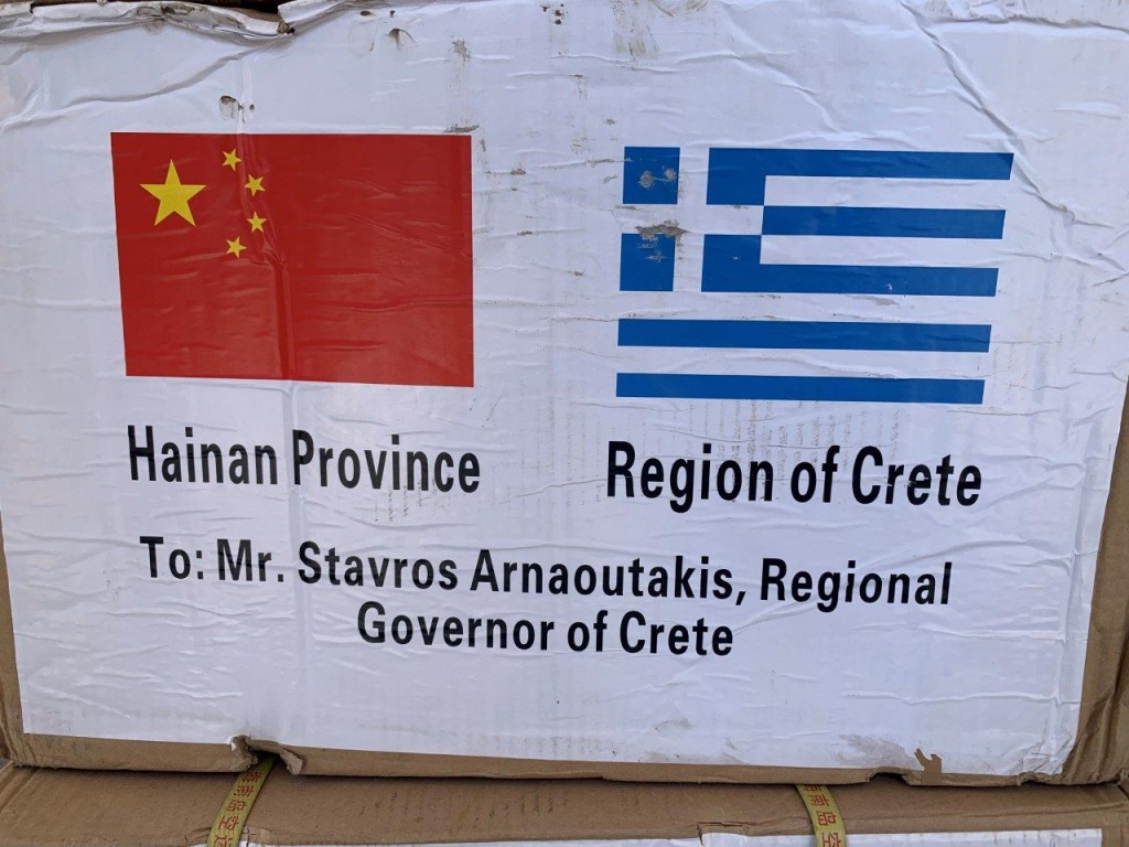 3.000 μάσκες υψηλής προστασίας (FPP2) παρέλαβε σήμερα η Περιφέρεια Κρήτης στο πλαίσιο προσφοράς που έκανε η επαρχιακή κυβέρνηση της Χαϊνάν (Hainan) από την Κίνα στην Κρήτη, ως έκφραση αλληλεγγύης και στο πλαίσιο της ευρύτερης συνεργασίας που έχει αναπτυχθεί ανάμεσα στις δύο περιοχές.