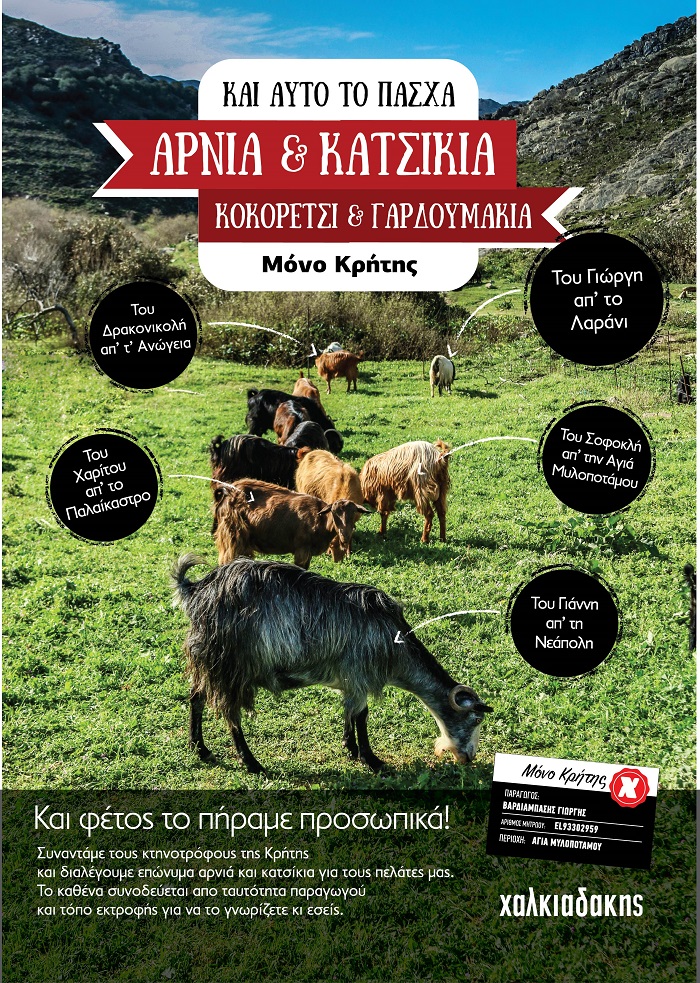 Και φέτος στα καταστήματα Χαλκιαδάκης οι καταναλωτές θα βρουν αρνιά και κατσίκια ΜΟΝΟ ΚΡΗΤΗΣ, στις καλύτερες τιμές της αγοράς! Τα σούπερ μάρκετ Χαλκιαδάκης, συναντούν τους κτηνοτρόφους της Κρήτης και διαλέγουν επώνυμα αρνιά και κατσίκια για τους πελάτες τους. Το καθένα συνοδεύεται από την ταυτότητα του παραγωγού και τον τόπο εκτροφής του για να το γνωρίζετε και εσείς. Μια καινοτομία των SM Χαλκιαδάκης για να είστε σίγουροι ότι επιλέγουμε πάντα το καλύτερο για σας…και φυσικά μόνο Κρήτης!