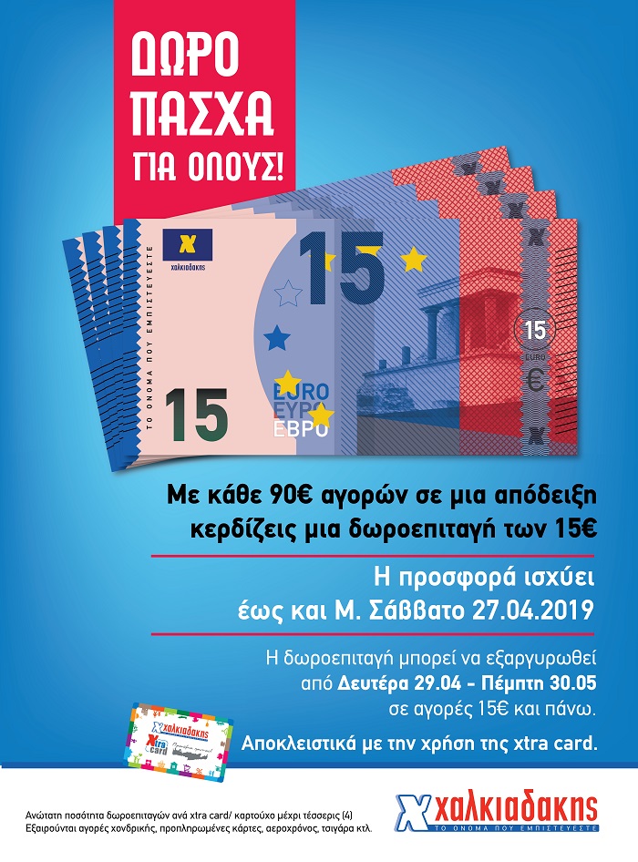 Η μεγάλη Κρητική εταιρεία Χαλκιαδάκης, εκτός του ότι γεμίζει το τραπέζι των καταναλωτών με τα καλύτερα προϊόντα του τόπου μας, σε ασυναγώνιστες τιμές, μας κάνει δώρο με κάθε 90€ αγορών, μια δωροεπιταγή ποσού 15€ για τις επόμενες επισκέψεις μας. Η μεγάλη προσφορά ισχύει για αγορές που θα πραγματοποιηθούν έως και το Μεγάλο Σάββατο, αποκλειστικά με την χρήση της xtra card Χαλκιαδάκης, και η εξαργύρωση των δωροεπιταγών μπορεί να γίνει από τη Δευτέρα 29 Απριλίου έως και την Πέμπτη 30 Μαΐου.
