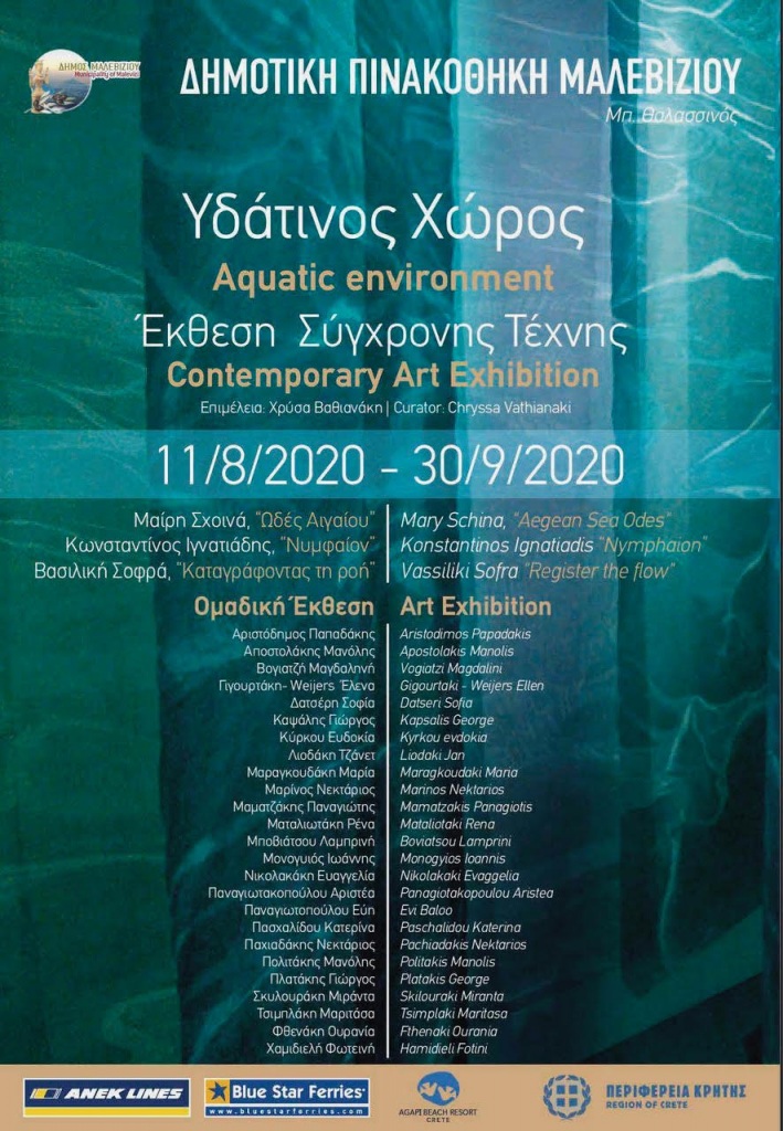 Η Δημοτική Πινακοθήκη Μαλεβιζίου στην Τύλισσο προσαρμοσμένη στις νέες συνθήκες στο πλαίσιο της πανδημίας του COVID 19, ανοίγει με ασφάλεια τις πύλες της, τηρώντας όλα τα ενδεδειγμένα μέτρα ασφάλειας. Με αισιοδοξία, δίνοντας έμφαση στην διαφύλαξη της δημόσιας υγεία υγείας, η Δημοτική Πινακοθήκη Μαλεβιζίου θα υποδεχτεί στον περιβάλλοντα χώρο της τους φιλότεχνους εγκαινιάζοντας την έκθεση σύγχρονης τέχνης «Υδάτινος Χώρος». Τα εγκαίνια της έκθεσης θα πραγματοποιηθούν την Τρίτη 11 Αυγούστου 2020 στις 8:00μ.μ. στον αίθριο χώρο της Πινακοθήκης στην Τύλισσο. Τη βραδιά των εγκαινίων θα πλαισιώσει με μουσικά ταξίδια το καλλιτεχνικό σχήμα των ΕΡΑΝ. Οι παριστάμενοι θα εισέρχονται ανά ολιγομελή τμήματα στις αίθουσες των εκθεμάτων.