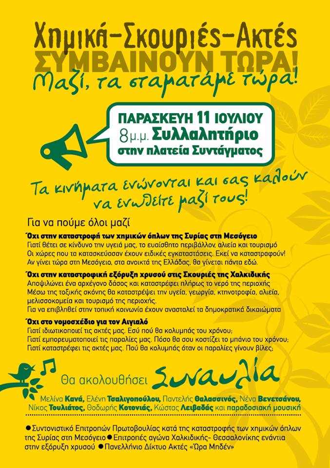Η υδρόλυση του μεγαλύτερου χημικού οπλοστασίου της οικουμένης γίνεται μία ανάσα από την Κρήτη και το μεγαλύτερο μέρος της Ελλάδας δεν το ξέρει καν. Οι Κρητικοί απόψε ετοιμάζονται να το φωνάξουν στο Σύνταγμα για να μάθει όλη η χώρα πως το πείραμα της Μεσογείου δεν είναι κάτι μακρινό και άσχετο από τις ζωές και το περιβάλλον όλων μας. Το απόγευμα Οργανώσεις και πολίτες που διαμαρτύρονται για τα Χημικά και την αποδόμισή τους στη θάλασσα δυτικά της Κρήτης συμμετέχουν στην κινητοποίηση που θα γίνει στην πλατεία Συντάγματος και ενώνουν τις φωνές τους με όσους αγωνιούν για όσα συμβαίνουν στις Σκουριές της Χαλκιδικής και όσα σχεδιάζονται για το ξεπούλημα των ακτών της χώρας μέσω ΤΑΙΠΕΔ. Της κινητοποίησης έπεται συναυλία με τους: Μελίνα Κανά, Παντελή Θαλασσινό, Νένα Βενετσάνου, Ελένη Τσαλιγοπούλου, Νίκο Τουλιάτο, Κώστα Λειβαδά, Θοδωρή Κοτόνια και παραδοσιακή μουσική.
