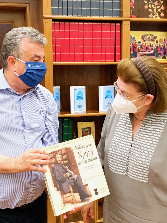 Σε ανασκόπηση των έργων που αφορούν τον Πολιτισμό και εκτελούνται αυτή την περίοδο στην Κρήτη από το Περιφερειακό Επιχειρησιακό Πρόγραμμα της Κρήτης, αλλά και σε χαρτογράφηση των αναγκών και των προτεραιοτήτων ενόψει της νέας προγραμματικής περιόδου, προχώρησαν η Υπουργός Πολιτισμού Λίνα Μενδώνη και ο Περιφερειάρχης Κρήτης Σταύρος Αρναουτάκης, κατά τη συνάντηση εργασίας που είχαν στην Περιφέρεια Κρήτης.