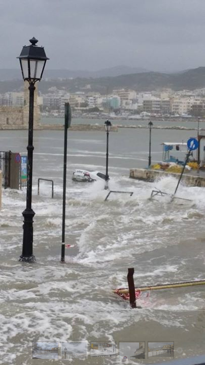 Οπως γράφει το rethemnosnews.gr, ήδη έχει παρασυρθεί από τα νερά ένα σταθμευμένο αυτοκίνητο που κατάληξε στον πυθμένα του ενετικού λιμανιού, το οποίο φαίνεται και από τις φωτογραφίες που τράβηξε και δημοσίευσε ο Στέλιος Αλεβυζάκης.