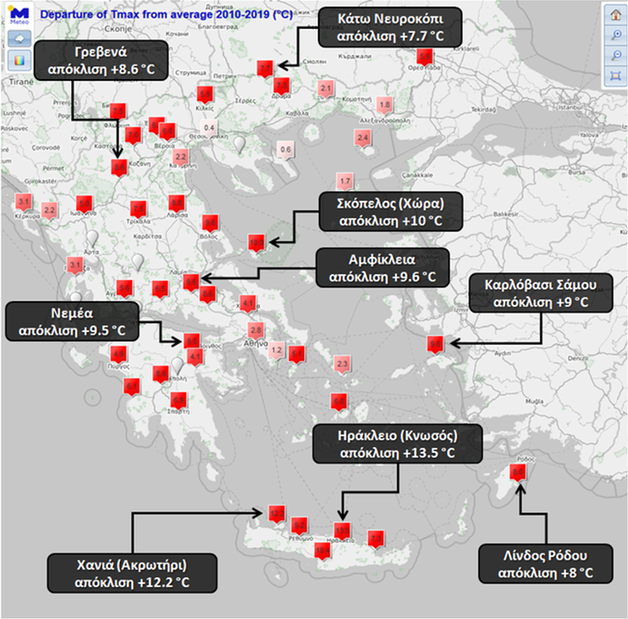 Η απόκλιση των μεγίστων θερμοκρασιών σε αρκετά σημεία ξεπέρασε τους 7-9 βαθμούς Κελσίου, ενώ στην Κρήτη, όπου η ζέστη ήταν πρωτοφανής γι' αυτή την περίοδο του έτους, οι μέγιστες θερμοκρασίες ήσαν έως και 13,5 βαθμούς Κελσίου υψηλότερες από τα κανονικά για την εποχή επίπεδα.