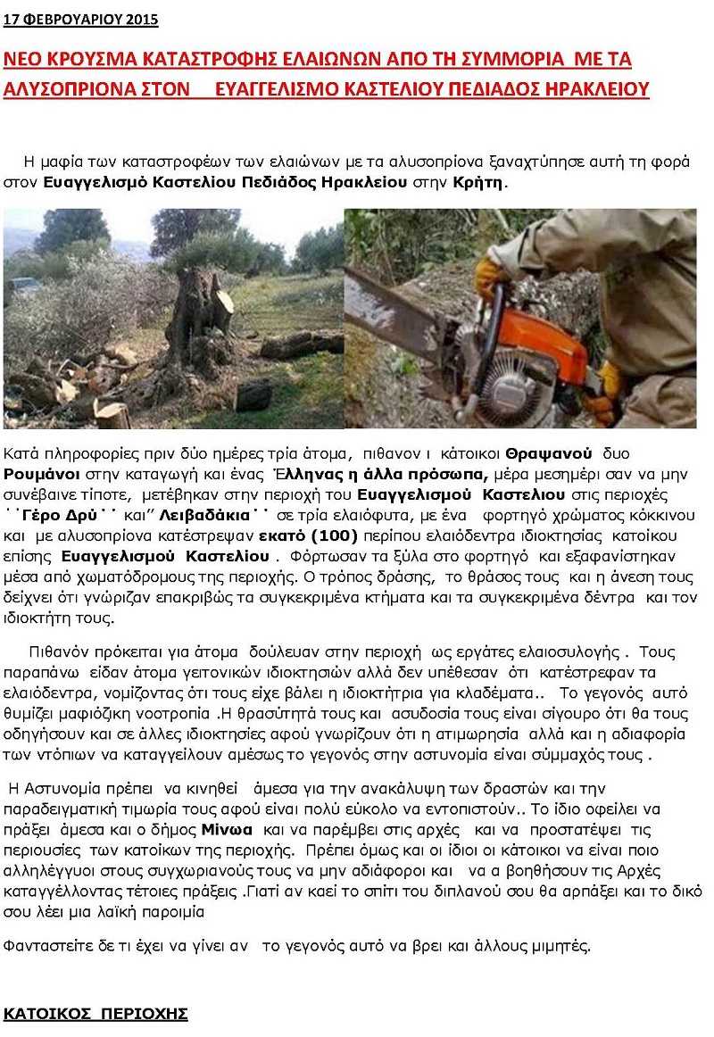 Καταγγελία ότι τρία άτομα, μέλη συμμορίας γυρνούν και καταστρέφουν τα ελαιόδεντρα σε περιοχές του Δήμου Μινώα Πεδιάδας, κάνει κάτοικος της περιοχής ο οποίος ζητάει άμεσα την παρέμβαση της αστυνομίας για την διαλεύκανση της υπόθεσης. Συγκεκριμένα η καταγγελία του κατοίκου είναι η παρακάτω:
