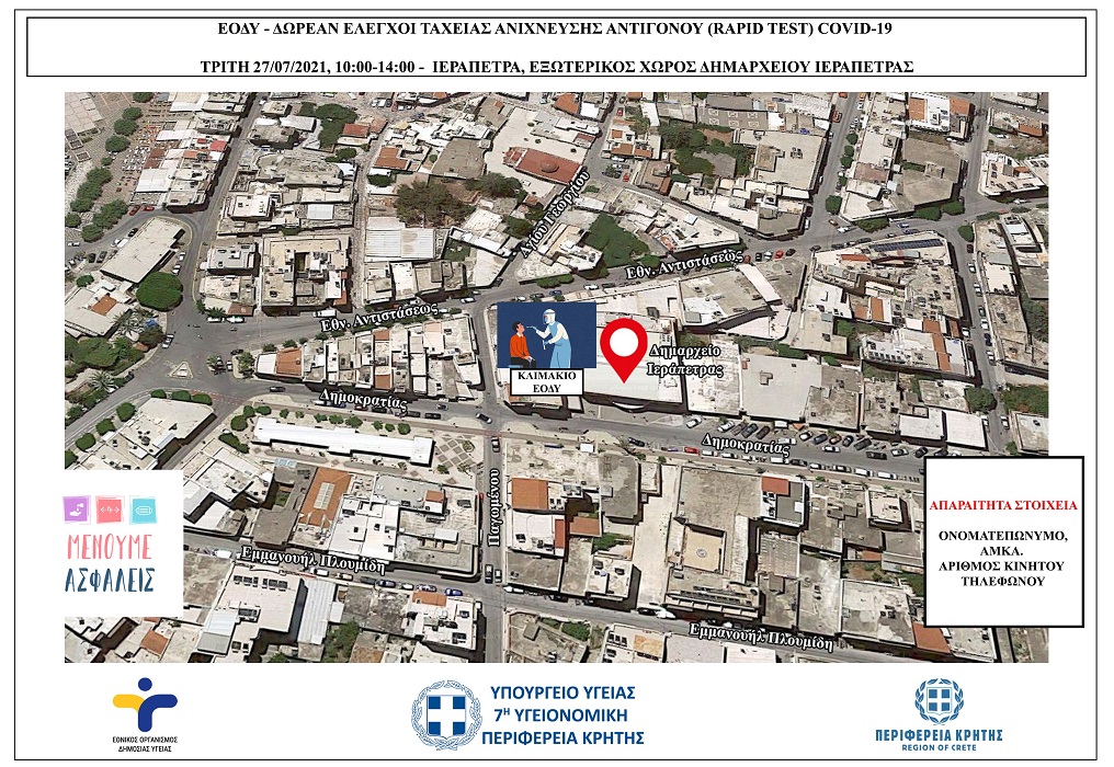 Έλεγχοι ταχείας ανίχνευσης αντιγόνου Covid-19 (rapid test) σε πεζούς θα πραγματοποιηθούν την Τρίτη 27/07/2021 από κλιμάκια του ΕΟΔΥ στην Ιεράπετρα.