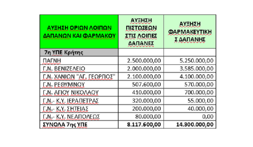 Συνοπτικός πίνακα με την κατανομή των πιστώσεων που έλαβαν τα Νοσοκομεία αρμοδιότητας της 7ης ΥΠΕ Κρήτης: