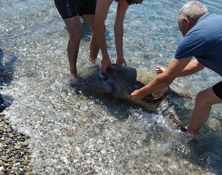 Το άτυχο ερπετό ήταν χτυπημένο και φαινόταν ταλαιπωρημένο και αποπροσανατολισμένο, καθώς παρά τις προσπάθειες των λουόμενων, δεν μπόρεσε να επιστρέψει στη θάλασσα.