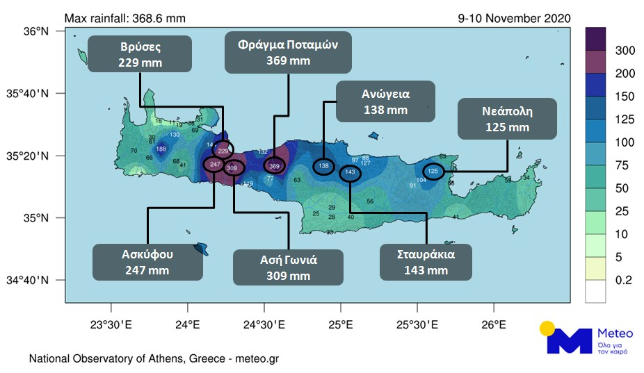 Πιο συγκεκριμένα, το μεγαλύτερο ύψος βροχής καταγράφηκε στο Φράγμα Ποταμών με 369 χιλιοστά νερού, ενώ ακολουθεί η Ασή Γωνιά με 309 χιλιοστά.